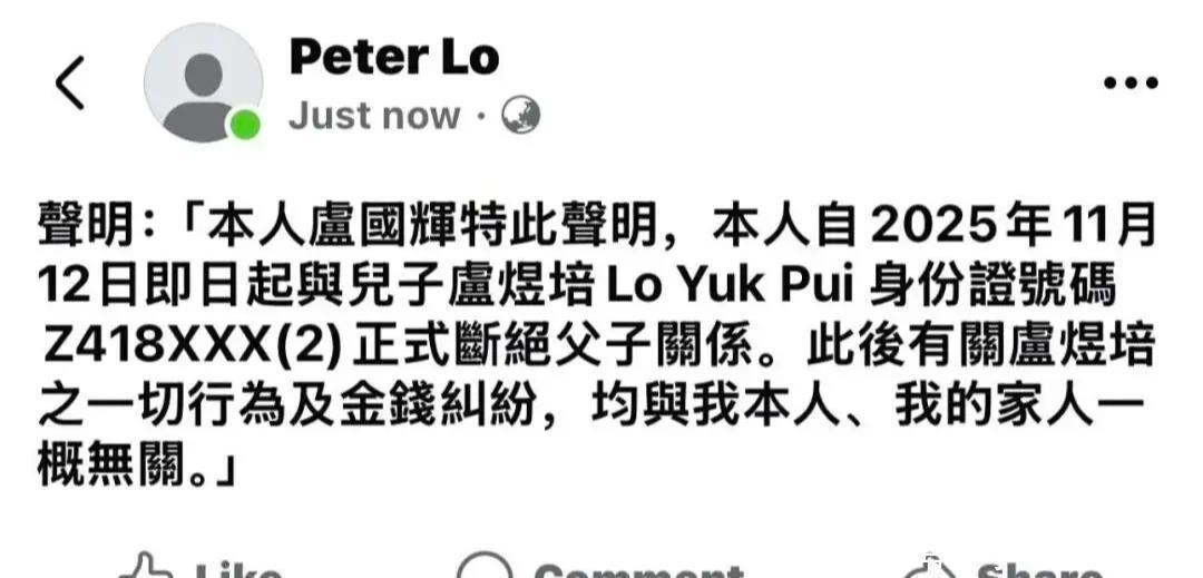 在这场风波中,最令人唏嘘的�岁的卢国辉老先生。这位老人多年来已为儿子偿还大量债务,甚至动用了自己的养老金,最终在无奈之下做出与儿子断绝关系的痛苦决定。